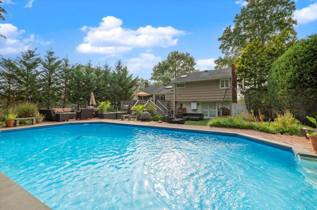 Welcome to 9 Flint Lane, a beautifully maintained home in one of Jericho’s most sought-after neighborhoods. This expanded split-level residence offers 3 bedrooms (with potential for 4) and 2 full bathrooms, blending comfort, flexibility, and modern updates. The inviting main level features a bright living room, formal dining room, and an eat-in kitchen with granite countertops, convection oven, and Andersen windows. An expansive den, full bath, closet, and private outside entrance creates the perfect option for a guest suite, home office, or 4th bedroom. A finished basement provides laundry, storage, and recreational space for added convenience. The true highlight is the private backyard retreat, designed for both relaxation and entertaining. Here, you’ll find a sparkling pool, deck, and professional landscaping, plus direct access to a neighborhood park—ideal for summer gatherings and year-round enjoyment. Located within the Jericho School District, with close proximity to the Hicksville train station, shopping, dining, and easy access to the LIE and Northern State Parkway, this home delivers both lifestyle and convenience. Don’t miss this rare opportunity to own a home that offers space, flexibility, and a backyard oasis in the heart of Jericho.